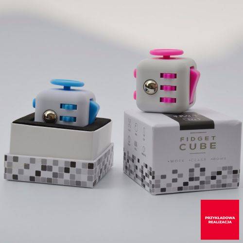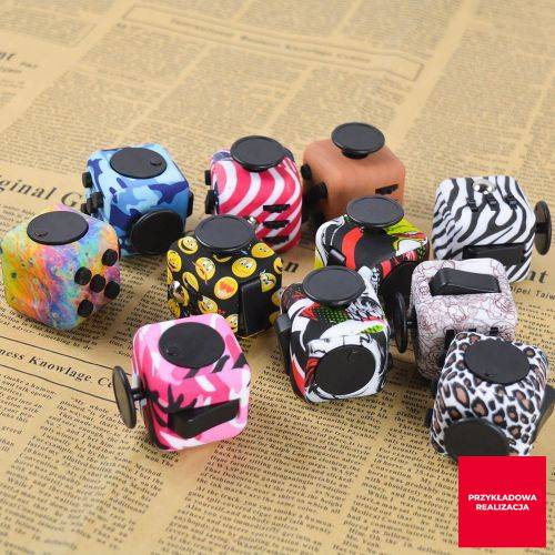 Plastikowa kostka sześcienna, z antystresującymi gadżetami na każdym boku