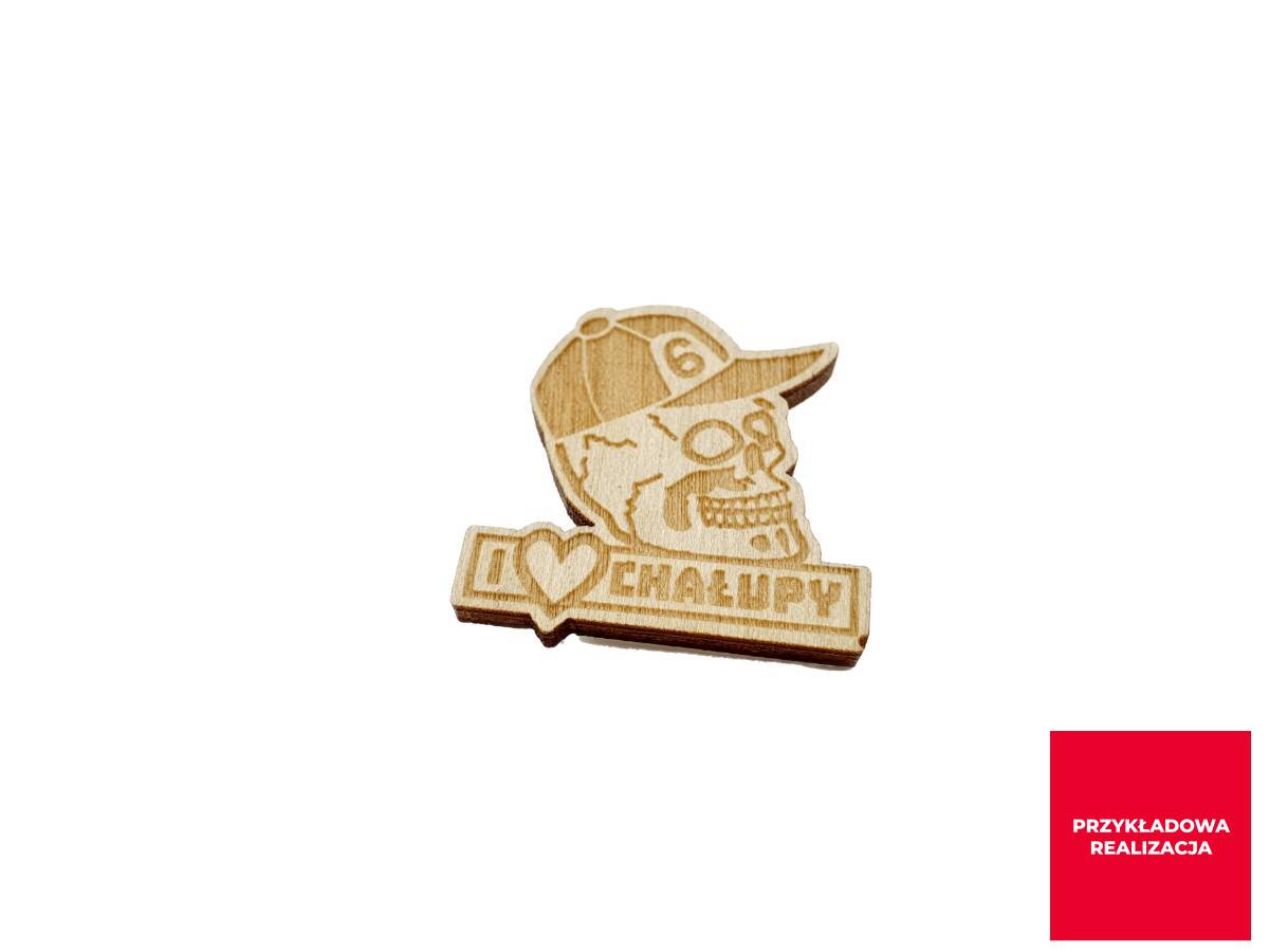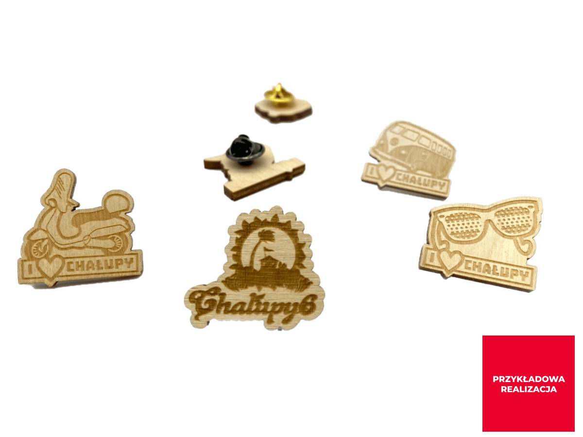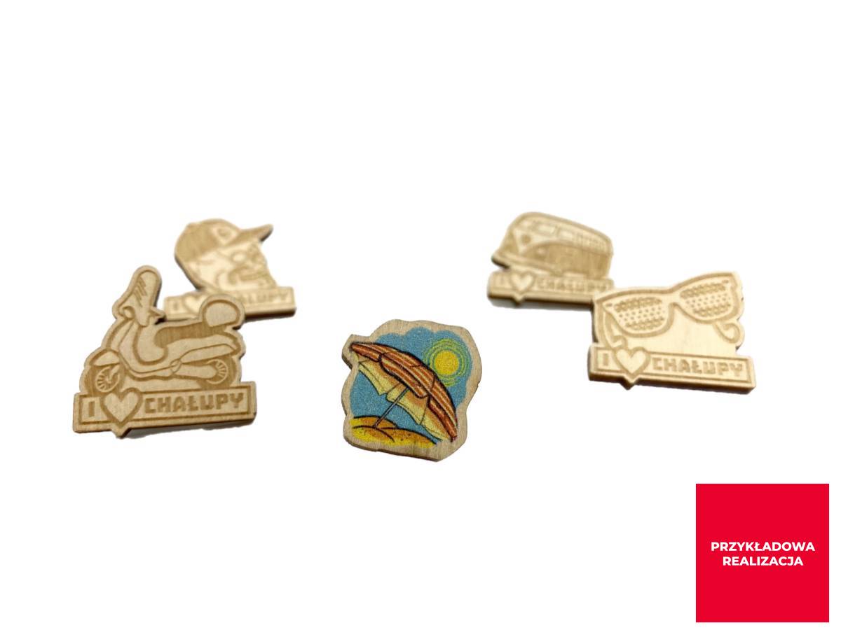 Materiał HDF-u ma to do siebie, że bardzo łatwo stworzyć możemy z niego dowolnie zaproponowany kształt, bez musu zmian czy wręcz uproszczania projektu. Nanieść możemy także grawer o różnej mocy nacinania, przez co może on być delikatny, bądź bardzo głęboki, ciemny i wyrazisty. Zamiast grawera możermy także zadrukować drewno w Fullcolor'ze, a więc nanieść na pina dowolną grafikę, z zachowaniem wszystkich jej ostrych kolorów!