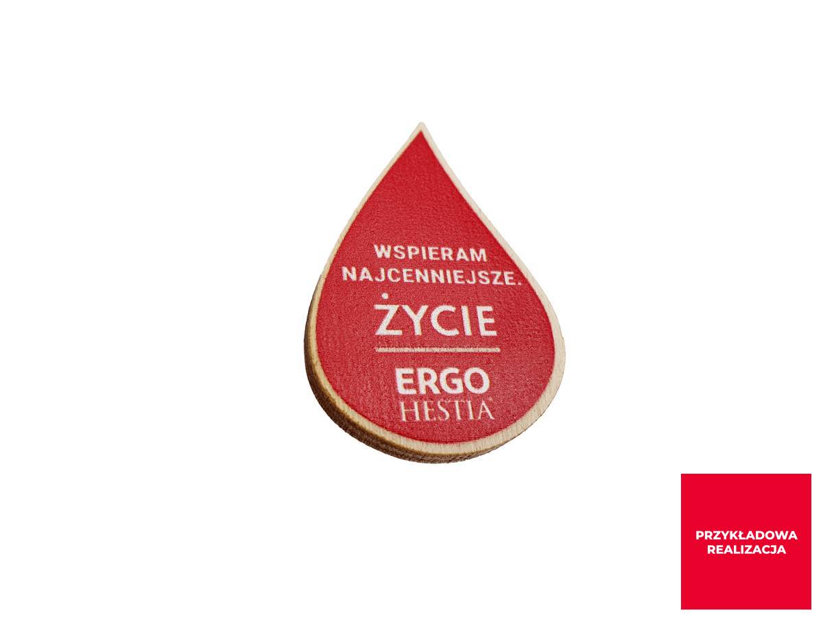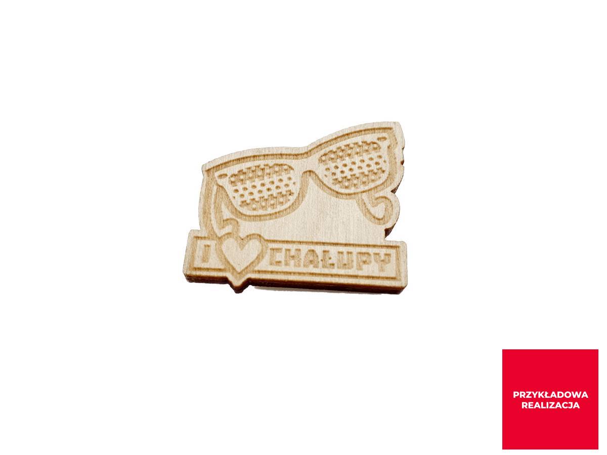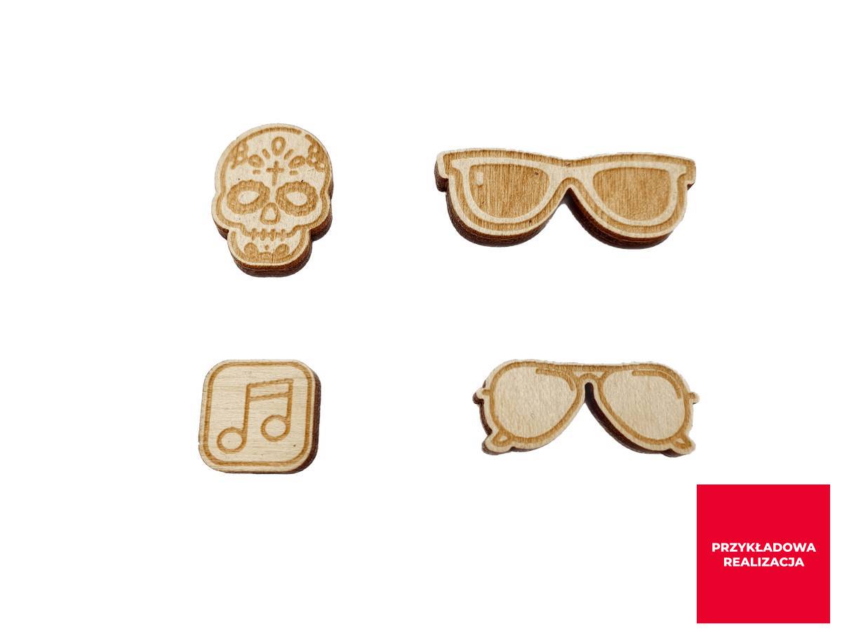 Materiał HDF-u ma to do siebie, że bardzo łatwo stworzyć możemy z niego dowolnie zaproponowany kształt, bez musu zmian czy wręcz uproszczania projektu. Nanieść możemy także grawer o różnej mocy nacinania, przez co może on być delikatny, bądź bardzo głęboki, ciemny i wyrazisty. Zamiast grawera możermy także zadrukować drewno w Fullcolor'ze, a więc nanieść na pina dowolną grafikę, z zachowaniem wszystkich jej ostrych kolorów!