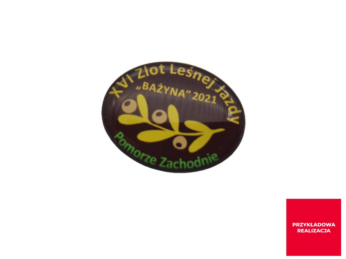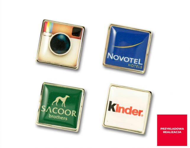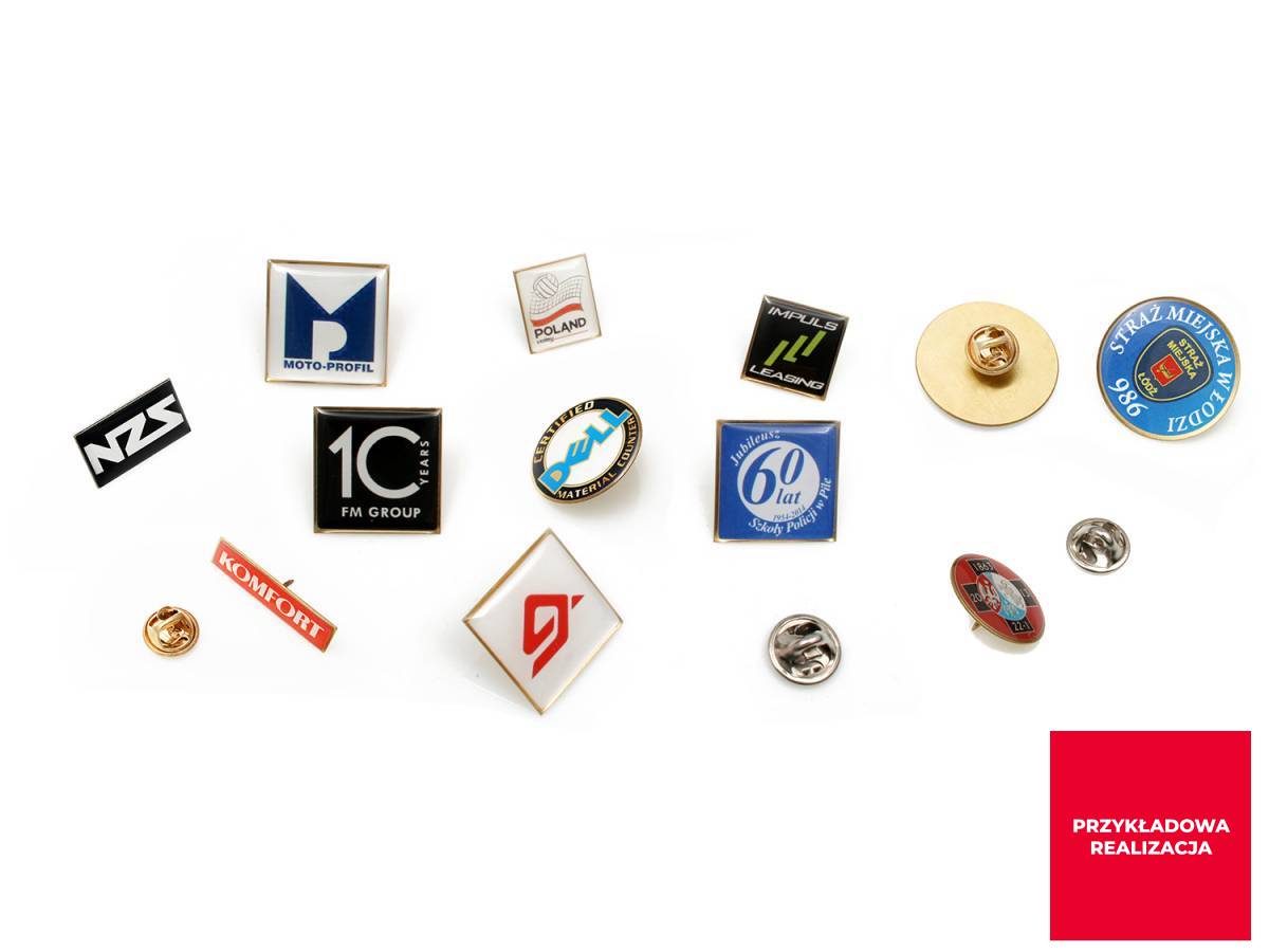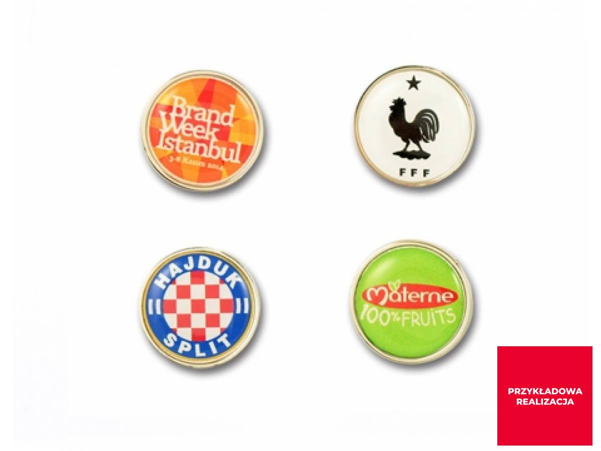 Posiadamy w ofercie 6 rozmiarów metalowych podkładów pod pinsy, które są przystosowane do naklejek epoksydowych. Dzięki wykorzystaniu gotowych podkładów czas realizacji jest krótszy a cena mniejsza. Naklejka epoksydowa pozwala na zastosowanie nadruku logo full color.