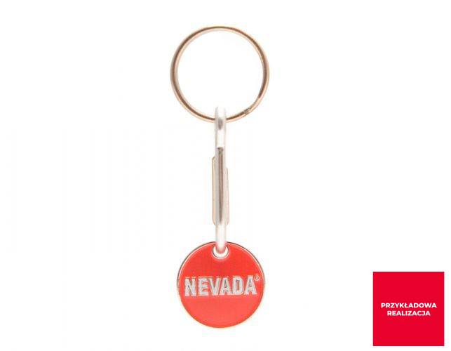 Solidny i praktyczny metalowy żeton do wózka sklepowego. Dzięki zawieszce w postaci karabinka
